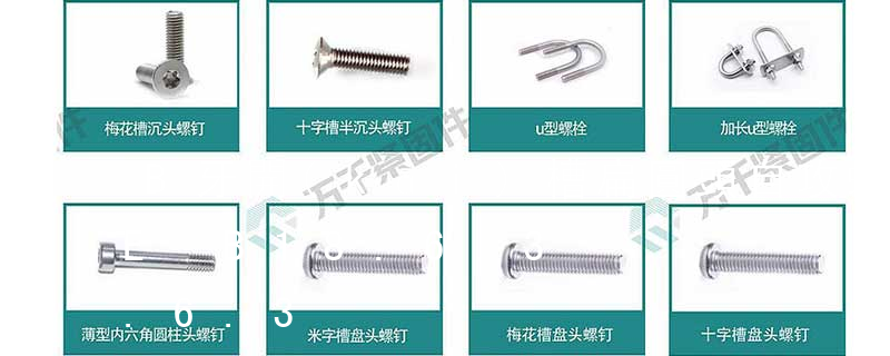 1.機(jī)螺釘 2.自攻螺釘 3.鉆尾螺釘 4.墻板釘 5.纖維板釘 6.木螺釘7.六角木螺釘 8.不脫出螺釘 9.組合螺釘 10.微型螺釘 11.家具螺釘 12.電子螺釘頭型:1.六角頭(hexagon head) 2.六角頭法蘭面(hexagon head with flange) 3.方頭(square head) 4.T形頭T head (hammer head)5.扁圓頭mushroom head(